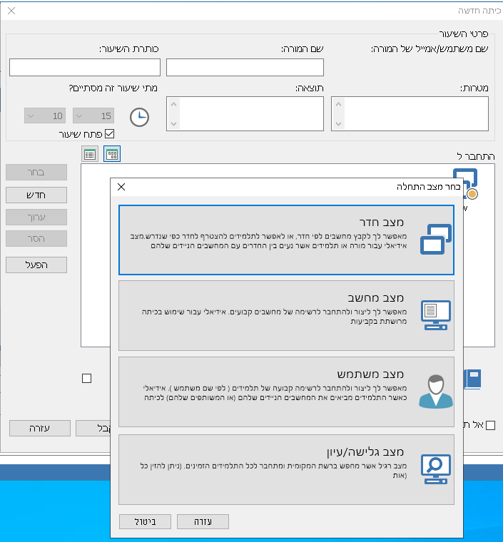 דרך שונה ליצירת חדר (כיתה) היא מצב מחשב, בו נרכיב את הכיתה ידנית. במצב זה יש להכניס שם כיתה חדש, ואז עיון: