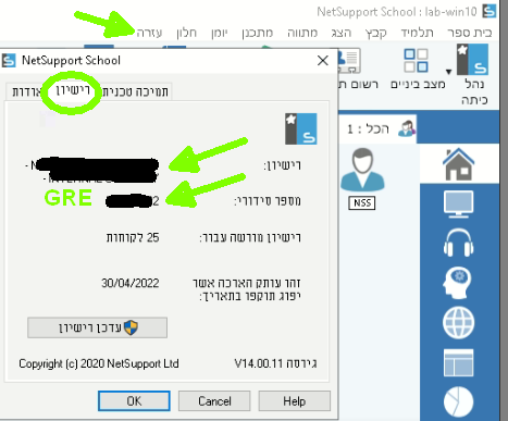 בפנייה צינו את פרטי הרישיון: לחצו על עזרה בתפריט השורה העליונה ואז רישיון