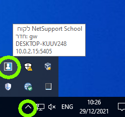 יש פינג בין המורה לתלמיד (כתובתו מופיעה כשסמן העכבר מרחף מעל סמל התוכנה, 10.0.2.15 בדוגמה)? לא - האם שניהם באותה רשת משנה (subnet) ?